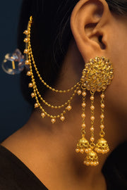 Step into royal elegance with these gold-plated kundan floral ear chain earrings from Khushana Jewellery. The intricate flower-shaped kundan stud is beautifully paired with cascading triple jhumka danglers, adorned with delicate pearls. The side ear chain design adds a regal touch, making it perfect for weddings and festive occasions.