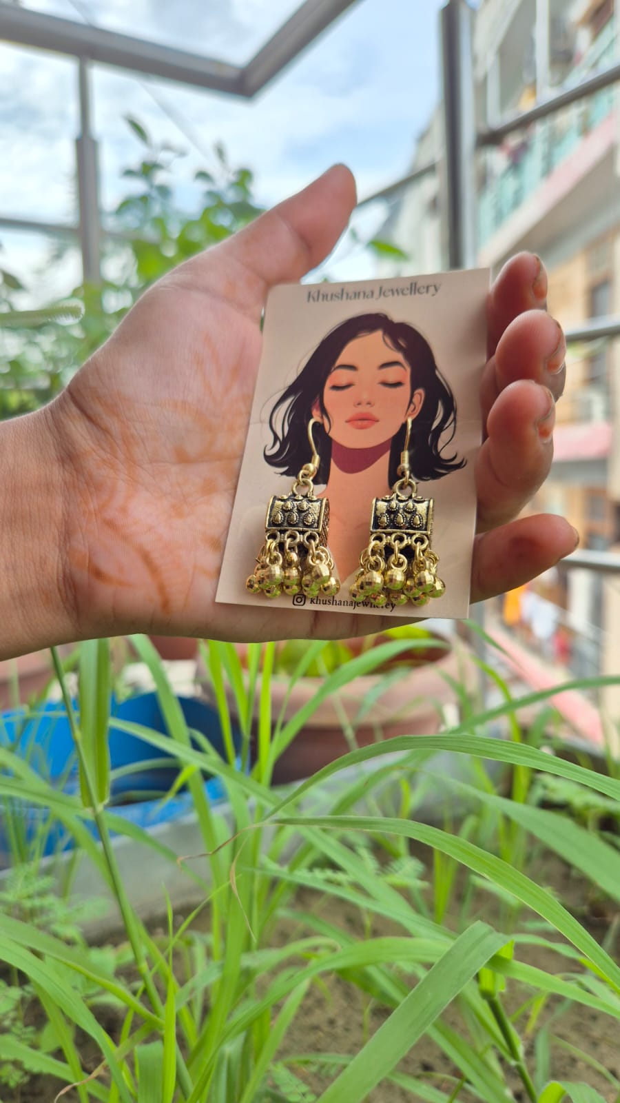Bring timeless charm to your look with these antique gold plated jhumka earrings adorned with ghungroo detailing. The rectangular top design with intricate carvings and multiple dangling beads gives them a classic ethnic touch.