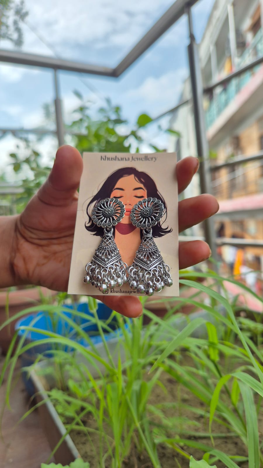 Antique Silver Floral Jhumka Earrings with Ghungroo