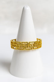 Bold meets minimal in the Reyah Lattice Band, a modern ring crafted with an open square-cut grid design that blends sharp edges and smooth gold tones. The textured antique-tarnish finish adds character, while its geometric pattern offers a contemporary twist to traditional ring styles. Lightweight yet eye-catching, this piece is perfect for stacking or solo statement wear.